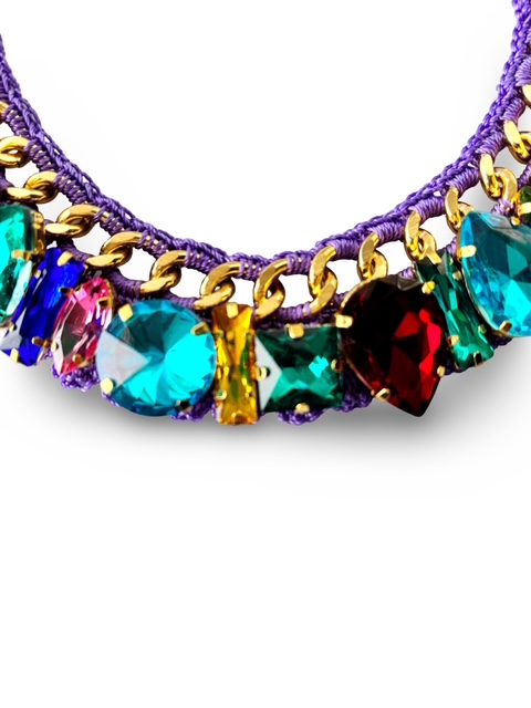 The Antoinette Heirloom Necklace blends intricate crochet craftsmanship with bold ornamental details. Hand-crocheted in a soft structured form, the necklace is adorned with luminous crystals and a gold-tone chain that runs through the design, creating a rich contrast between texture and shine.