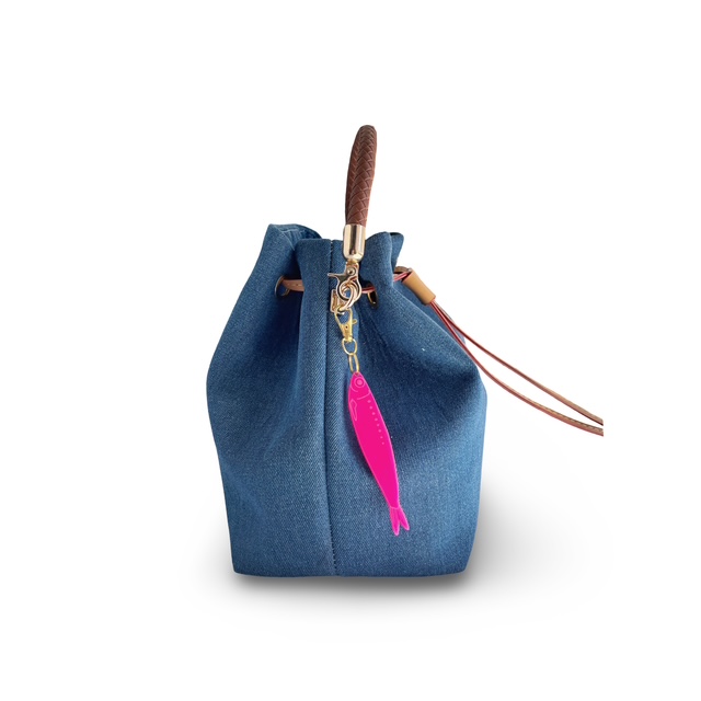 Details that make her stand out: a playful sardine keychain, an inner pocket for quick access, and sleek leatherette handles with a drawstring closure for that modern coastal feel.