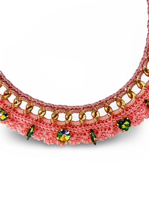 The Antoinette Heirloom Necklace blends intricate crochet craftsmanship with bold ornamental details. Hand-crocheted in a soft structured form, the necklace is adorned with luminous crystals and a gold-tone chain that runs through the design, creating a rich contrast between texture and shine.